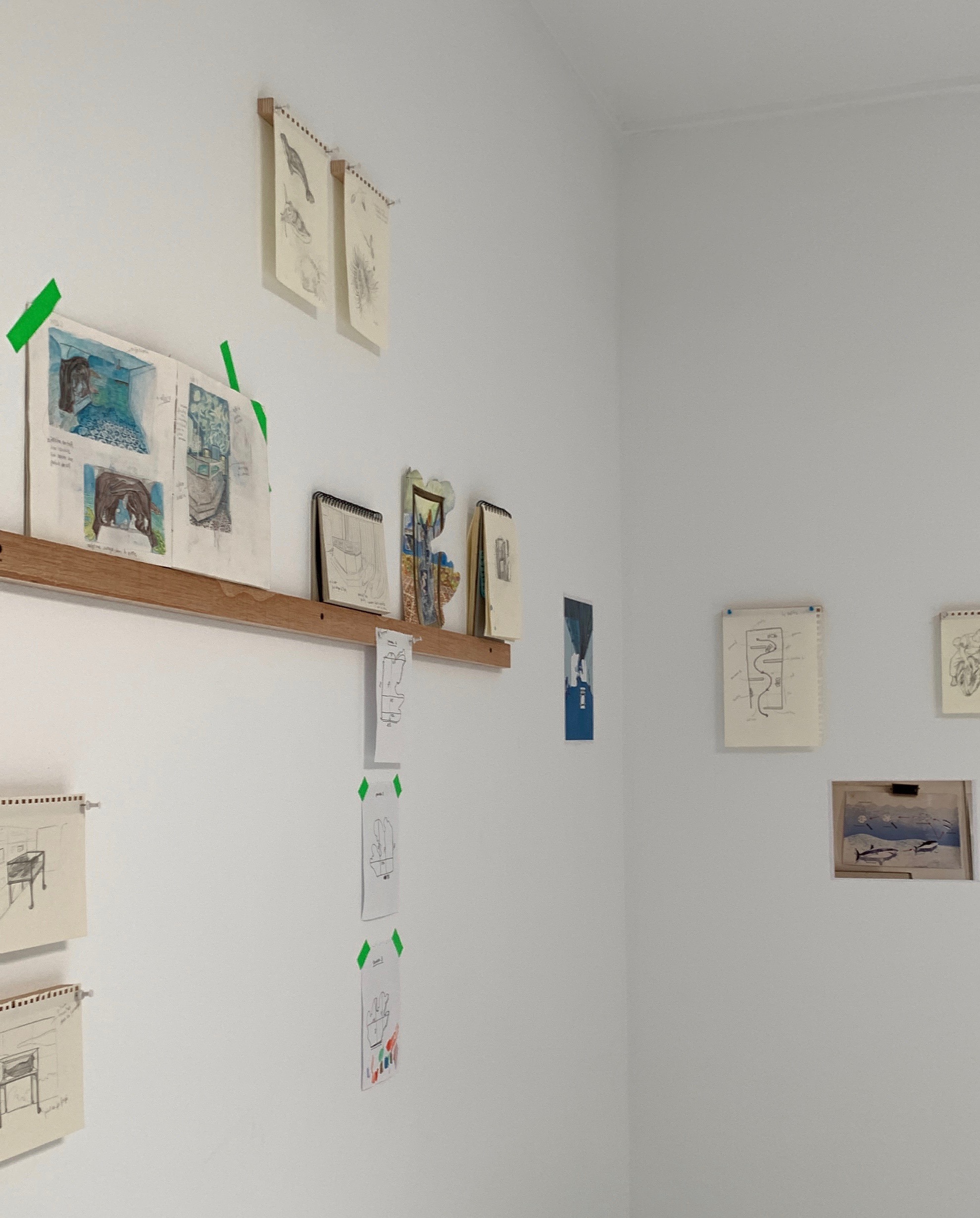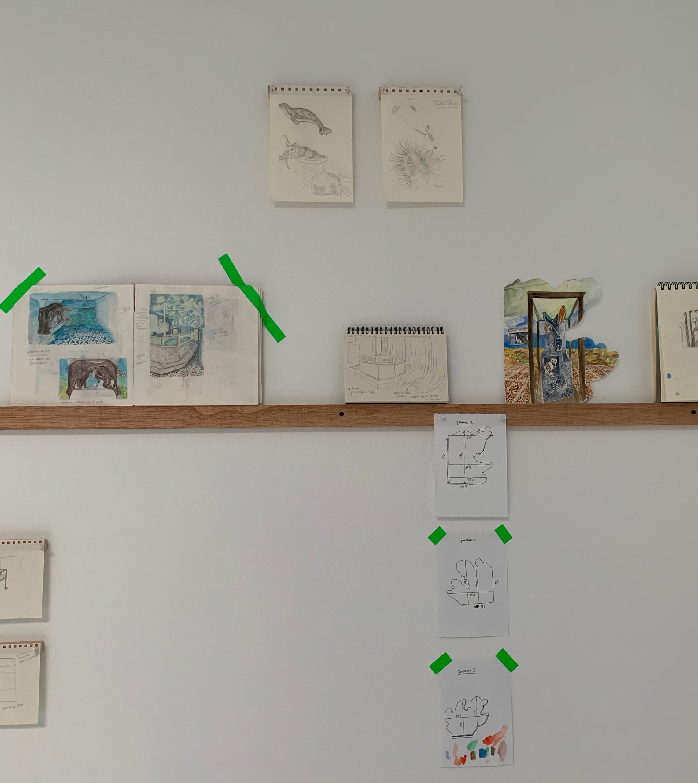 Croquis, esquisses et dessins préparatoires présentés dans un espace uniquement dédié à l’exposition du processus créatif de l’artiste dans le cadre de son projet.